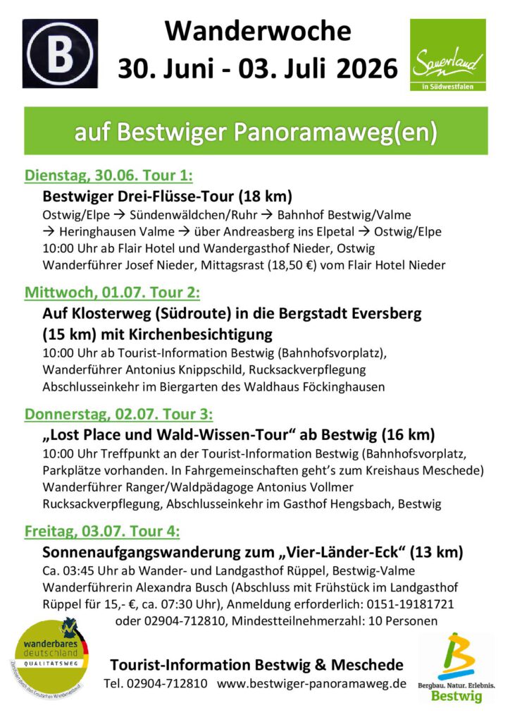 Wanderwoche auf Bestwiger Panoramawegen vom 30. Juni bis 3. Juli 2026
